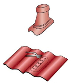 Кровельный материал расчерчивается по лекалу и вырезается необходимое число отверстий. Вентиляционный выход фиксируется саморезами к кровле без использования герметика. Основной вентиляционный выход устанавливается соответственно уровню воздуховода.