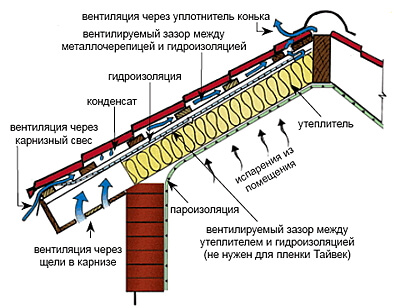 Гидроизоляционная пленка предназначена для защиты утеплителя от влаги и располагается со стороны металлочерепицы. Пароизоляционная пленка предохранит утеплитель от испарений внутри помещения. Немаловажную роль играет вентиляция. Необходимо, чтобы от карниза к коньку воздух проходил беспрепятственно.