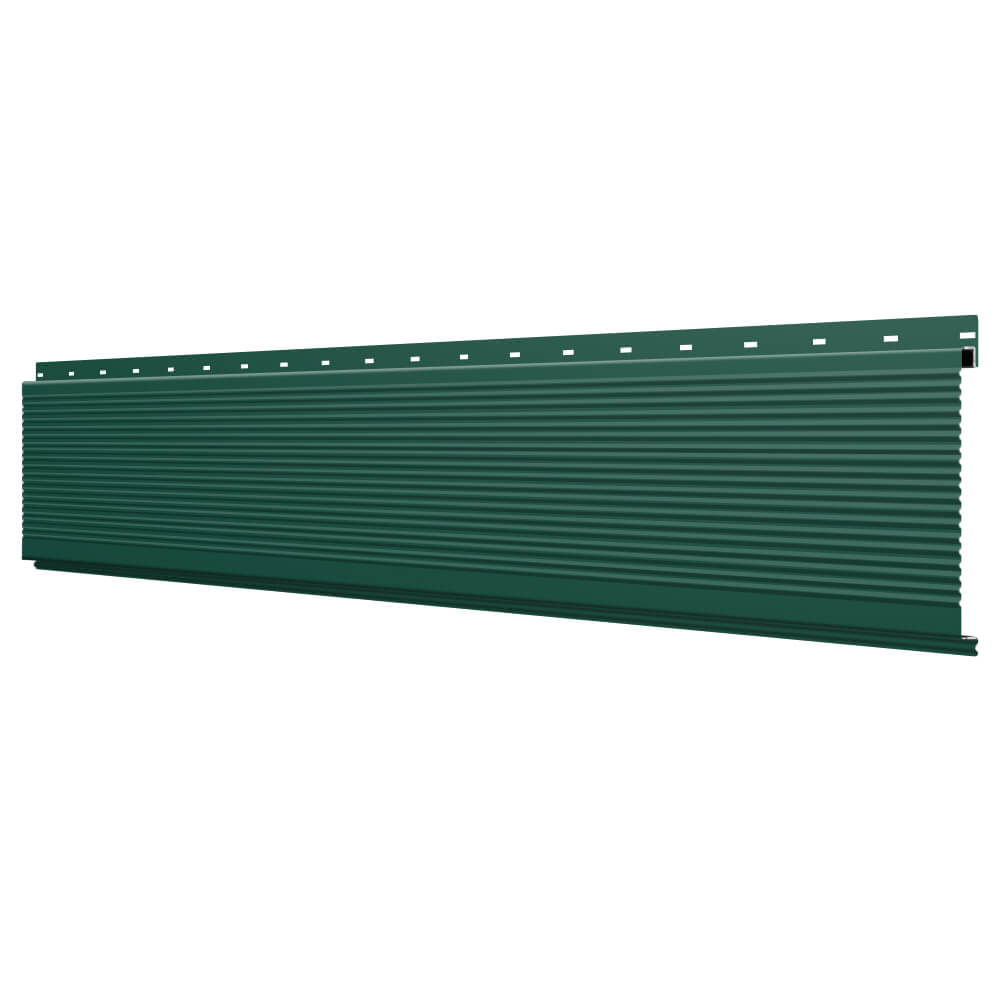 Линеарная потолочно-стеновая панель РИФЛЕНАЯ усиленная цвет RAL6005 Зеленый Мох применяется в качестве софитов для подшивы крыши, наружной и внутренней отделки потолков, стен, фронтонов фасада дома в Благовещенске.