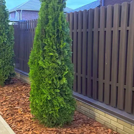 Забор Еврожалюзи Античное Дерево 3D Принтек двусторонний, Забор Еврожалюзи RAL8017 МАТТЕ Коричневый матовый двусторонний, Штакетник Полукруглый RAL8019 МАТТЕ Темный Шоколад двусторонний на заборе, Забор шахматка штакетник Широкий Античное Дерево 3D двусторонний, Колпак Everest Коричневый на столбах палисадника, Колпак Everest коричневый для столбов кирпичного забора