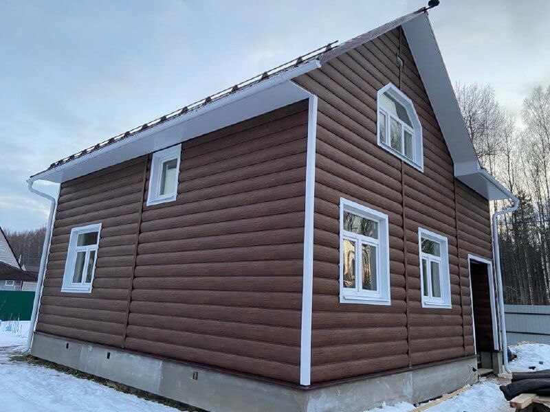 Отделка фасада дома металлическим сайдингом под рубленое бревно (имитация деревянного сруба)
