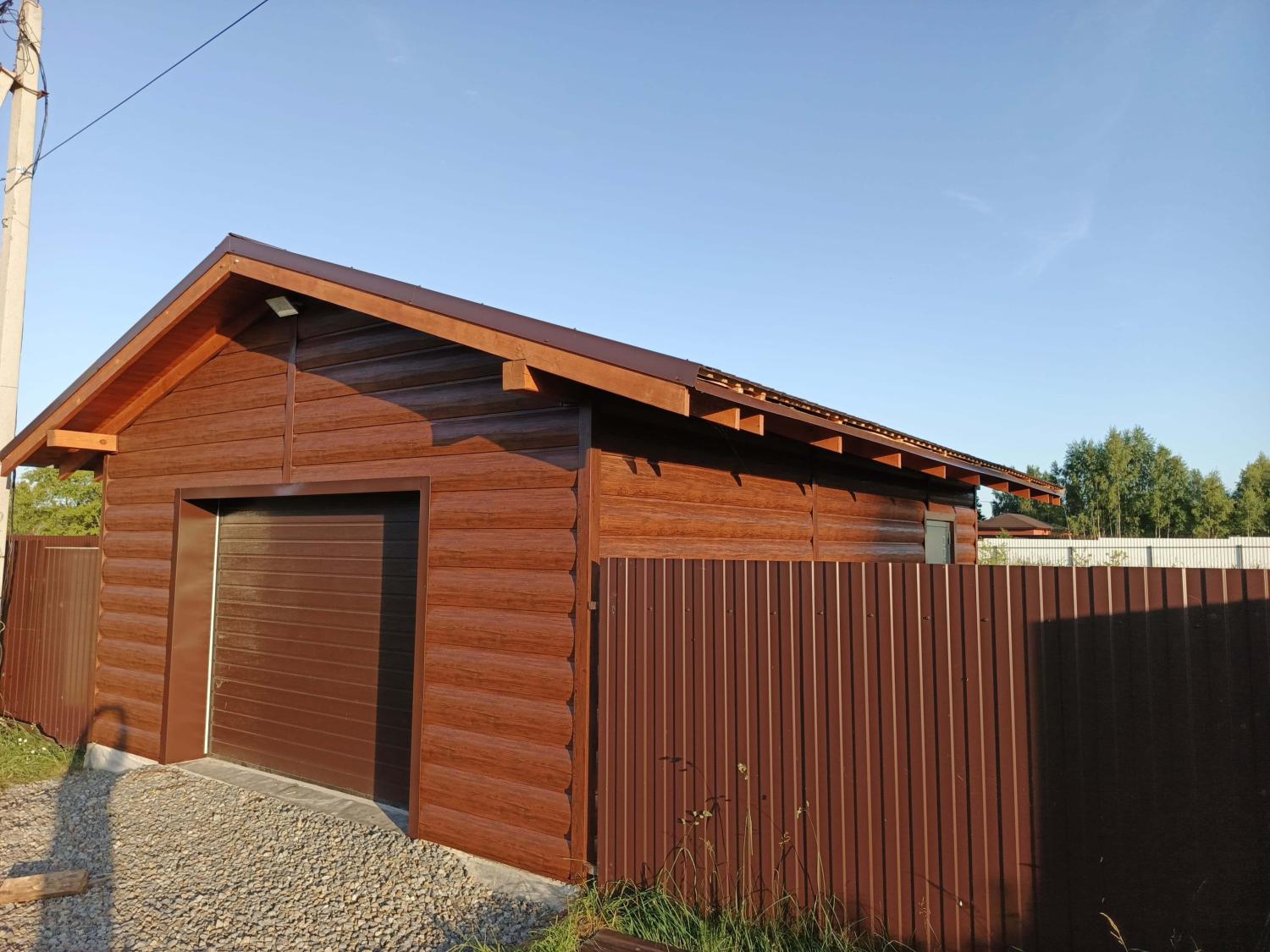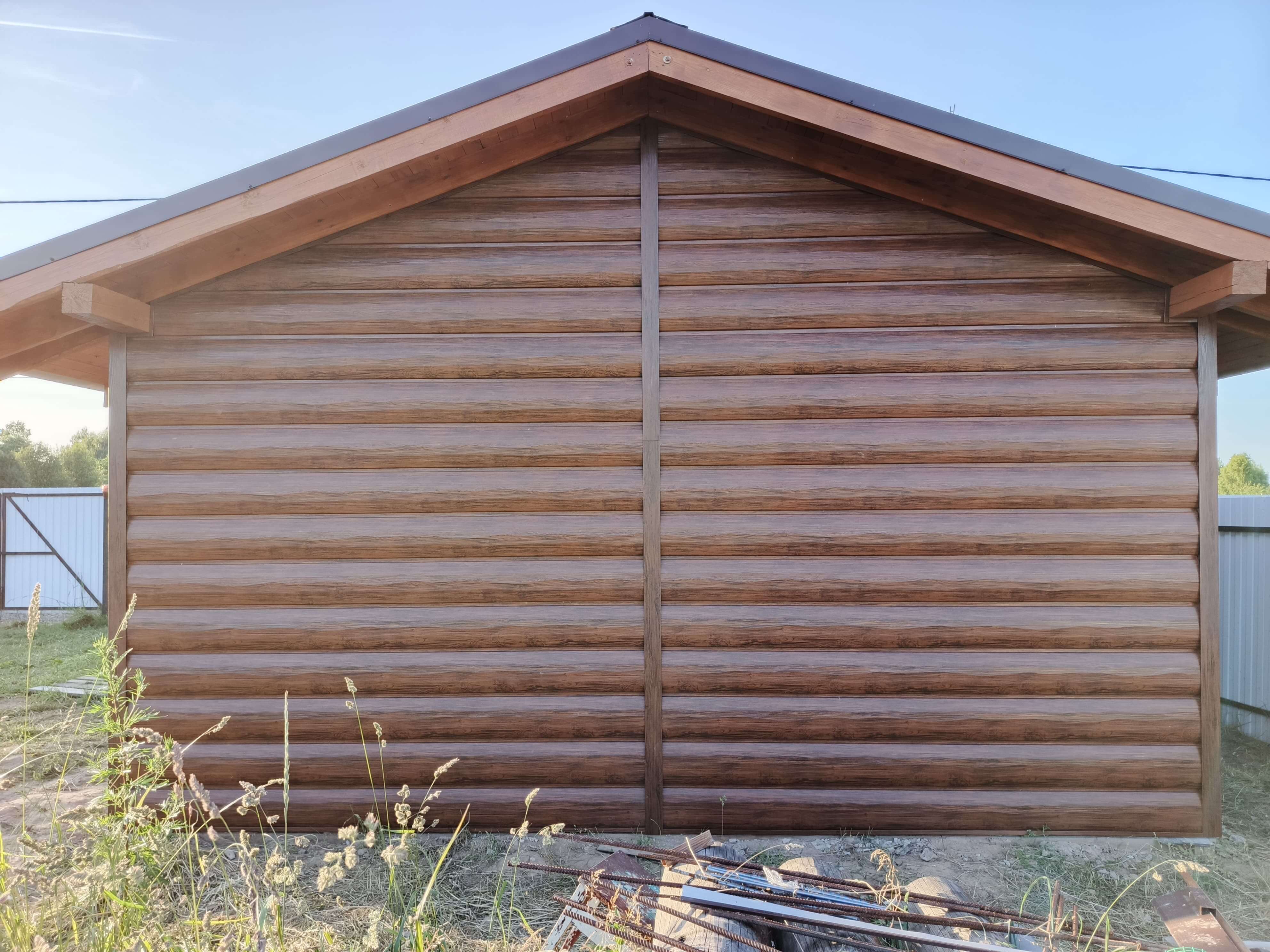 Отделка фасада гаража металлическим сайдингом под рубленое бревно (имитация деревянного сруба)