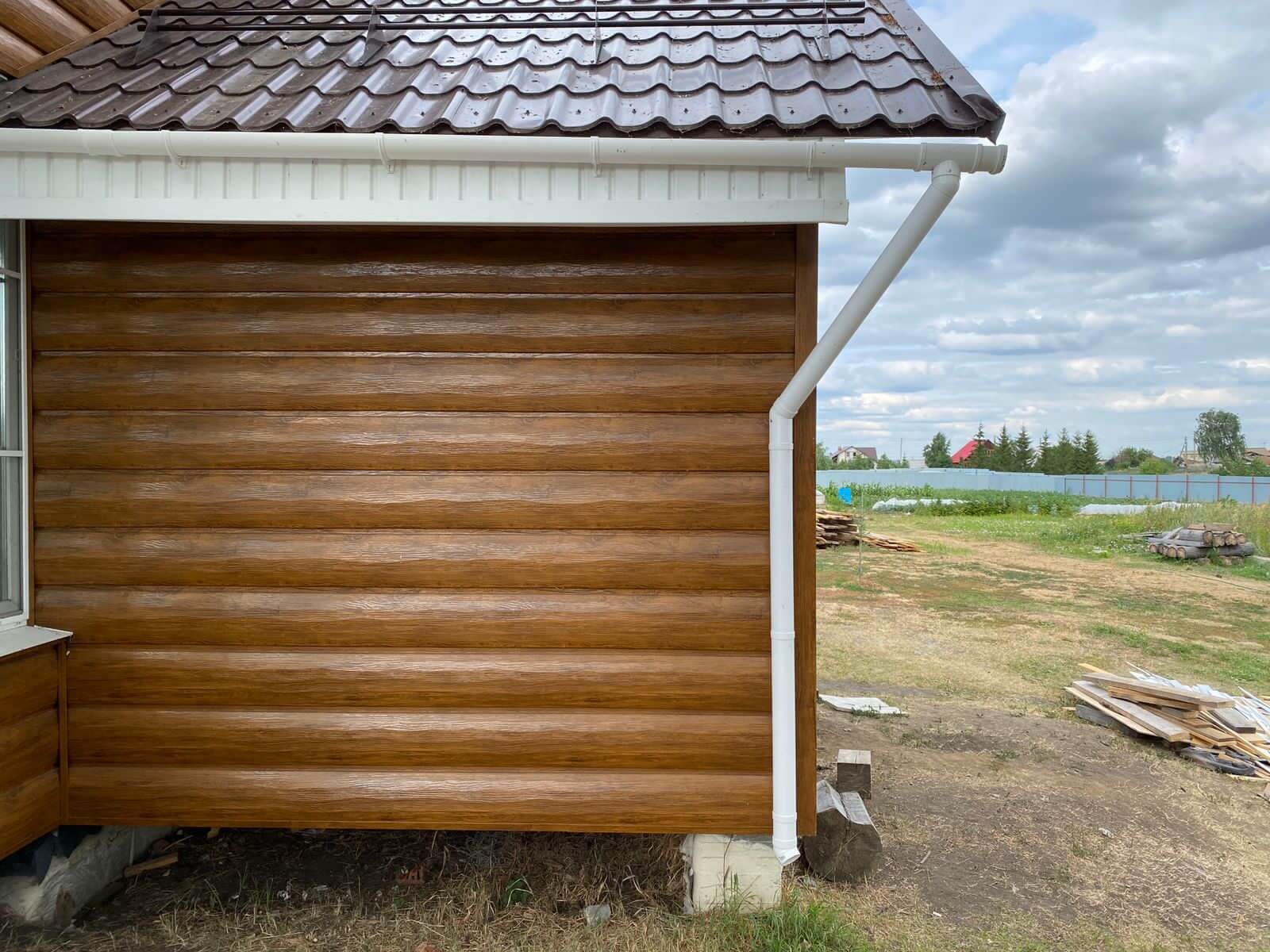 Еще один безупречно выполненный объект — фасад из "Царьсайдинга" (Бревно рубленое 4Д) в оттенке под дерево "Орех"