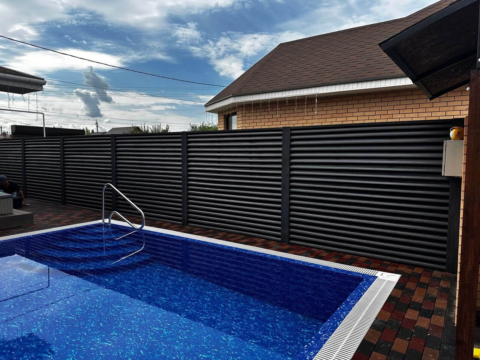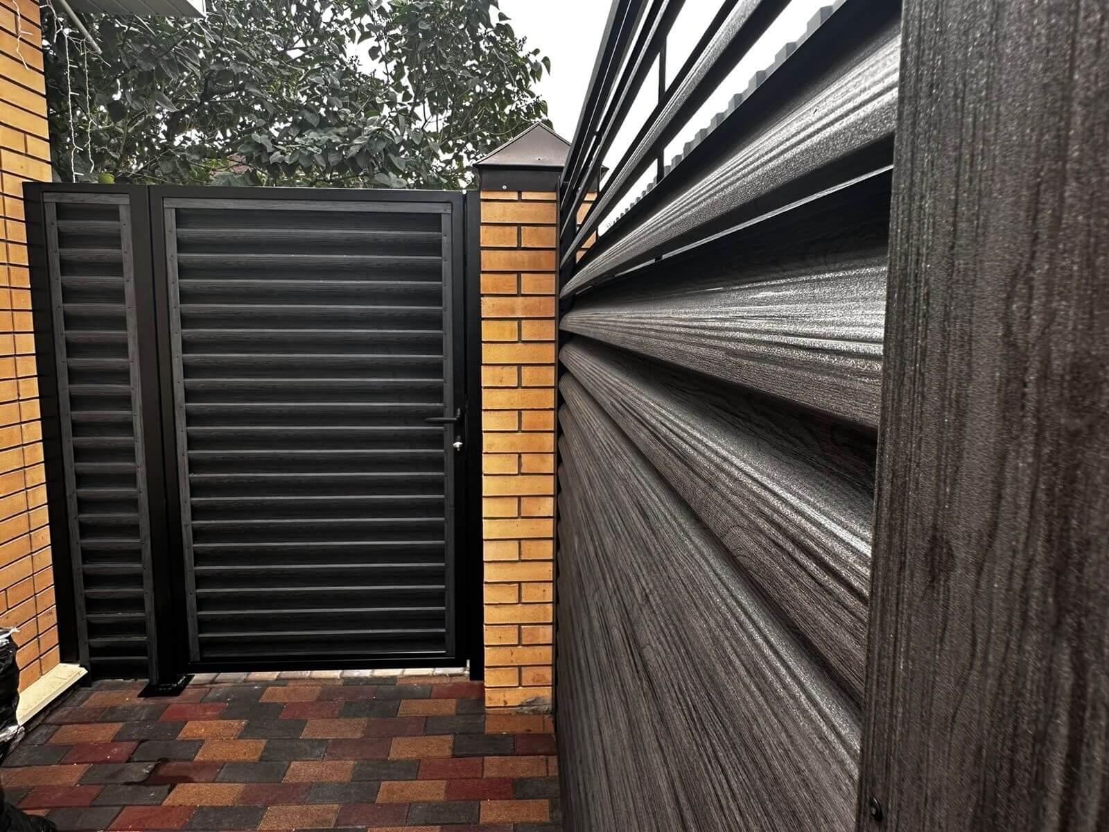 Секция забора жалюзи из ламелей еврожалюзи Черное Дерево 3D Принтек с кирпичными столбами анфас двусторонний Вид спереди забор ламели еврожалюзи Черное Дерево Принтек односторонний Вид сзади забор ламели еврожалюзи Черное Дерево Принтек односторонний Ламели еврожалюзи Черное Дерево 3D Принтек односторонний сертификат Ламель Еврожалюзи Черное Дерево 3D односторонний для заборов-жалюзи, беседок, пергол